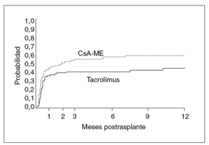 Fig. 1. Probabilidad de presentar rechazo según la inmunodepresión primaria (ciclosporina en microemulsión, n = 90 niños; tacrolimus, n = 91 niños). El primer mes es el momento de máxima incidencia de rechazo. La probabilidad acumulada a lo largo del primer año postrasplante fue de 59,8% (CSA-ME) y 44,5% (Tac) (p = 0,028). Tomada de Kelly DA, Jara P, Rodeck B, Lykavieris P, Burdelski M, Becker M, et al. Tacrolimus and steroids versus Ciclosporin microemulsion, steroids and Azathioprine in children undergoing liver transplantation: randomised European multicentre trial. Lancet. 2004;364:1054-61.