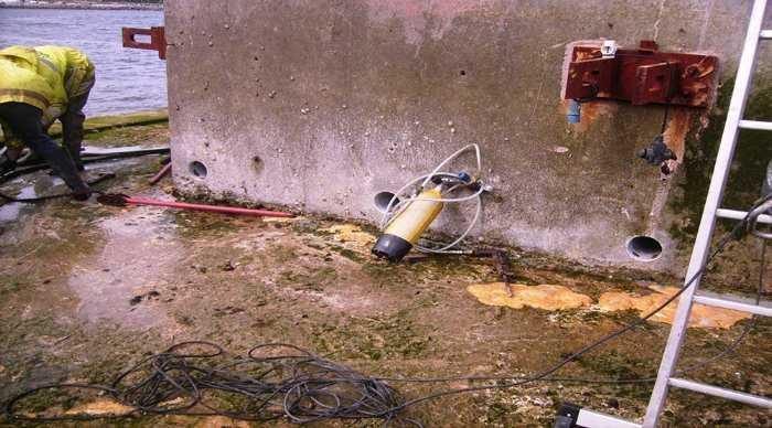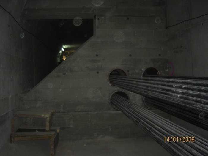 La primera propuesta hecha por FHECOR Ingenieros Consultores consistía simplemente en aumentar la resistencia de la cimentación mediante el hormigonado de una losa sobre las zapatas y encepados existentes, para de ese modo aumentar su canto y permitir que la armadura existente, con más canto, soportara las nuevas cargas adicionales. Se comprobó que la superficie de contacto entre el hormigón nuevo y el viejo era capaz de transmitir las cargas mediante un mecanismo de cohesión/fricción. Para garantizar una superficie con alta capacidad de fricción se generó una superficie rugosa como la mostrada en la Figura 12 (ver también Figura 11), en la que se ve una vista superior del espacio entre los 2 fustes de la pila protegida por el recinto estanco metálico usado para poder trabajar con independencia de las mareas.