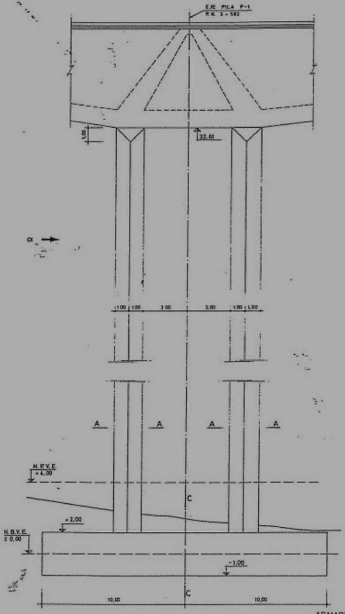 • Para los fustes de las pilas extremas, las condiciones de seguridad eran diferentes para el fuste lado margen o lado ría. El fuste lado ría presentaba unas condiciones de seguridad adecuadas. Para los fustes del lado margen se planteaban algunas dudas sobre la capacidad resistente de las secciones de arranques y cabeza. No obstante, considerando una disipación de los esfuerzos debidos a deformaciones impuestas en estado límite último (ELU), debido a la pérdida de rigidez por fisuracion, las condiciones de seguridad podían considerarse adecuadas.