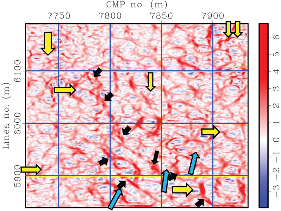 Para el atributo de curvatura (figura 11), comparando con el resultado mostrado del cálculo de curvatura de amplitud, previo a efectuar la atenuación de huella de adquisición (figura 4b), es posible notar que los rasgos señalados con flechas en esa imagen, ya no son representativos en esta otra, y ahora es posible identificar más rasgos estructurales (flechas amarillas o claras).