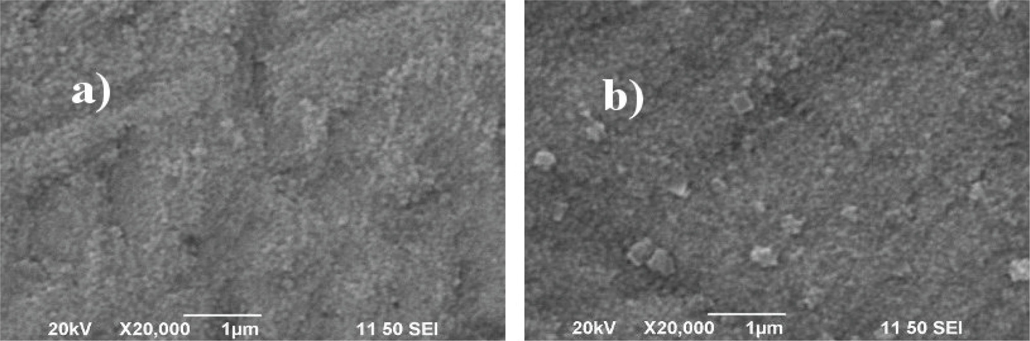 Resultados y discusiónLas mediciones de perfilometría mostraron que el espesor obtenido en las películas delgadas de BTO es de alrededor de 365±10 nm, mientras que el análisis por EDS de su composición química indicó que éstas son estequiométricas. En la figura 2 se muestran micrografías que se obtuvieron a través del MEB de las películas de BTO crecidas sobre sustratos de nicromel con temperatura de sustrato (figura 2a) y tratamiento térmico empleando un sistema externo (figura 2b), en ambos casos a 548.8°C.