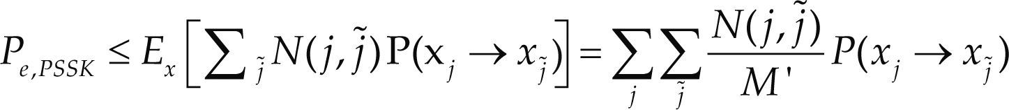 Utilizando este principio, la probabilidad de error en bits para el esquema PSSK se acota como la suma de las contribuciones de cada antena y cada símbolo de la siguiente manera (Jeganathan et al., 2008b)