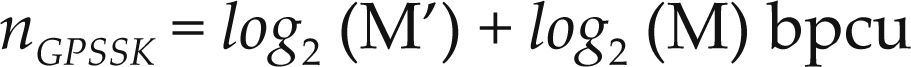 El número de puntos de la constelación espacial M’ se calcula como la combinación donde M’ se elige como M’ = 2k, k entero. Por lo tanto, la cantidad de bits n por uso de canal que pueden transmitirse en GSSK es