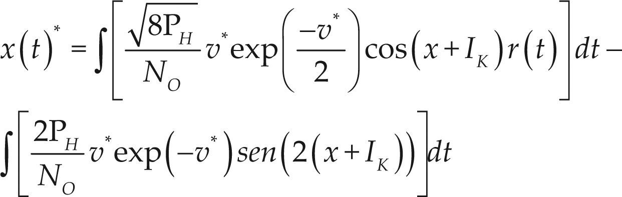 Usando las ecuaciones (9)-(12) se pueden obtener las ecuaciones de estimación de fase x*(t) y varianza v*(t) requeridas por el estimador-correlacionador (Snyder, 1969), donde fLT es el ruido de fase total de la señal óptica de batimiento. Con estas expresiones se realiza la estimación del dato transmitido. La entrada de los bloques “estimador” (figura 1b) es el observable eléctrico (ecuación 7).