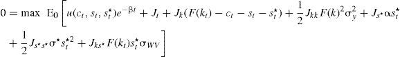 donde F(kt)=Akt. Esta expresión se conoce como la ecuación de Hamilton, Jacobi y Bellman (h-j-b).Condiciones de primer ordenSe define la función de valor J(kt,st*,t)=V(kt,st*)e−βt, y se calculan las derivadas parciales respecto a las variables de estado y tiempo, es decir: