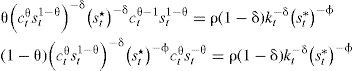 Después de dividir la ecuación [9] entre (s*)−φ, descomponiendo el término [•](δ−1)/δ y dividiendo entre k1−δ y ρ la razón consumo capital se puede expresar como: