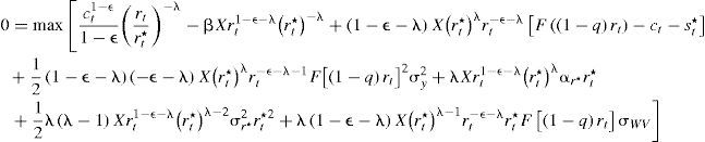 que nos lleva a:Solución y tasa de crecimiento de la riquezaSe propone como candidato de solución a V(rt,rt*)=Xr1−ε−λrt*λ, y se supone que la función de utilidad es de la forma uct,rt,rt*=ct1−ε/1−εrt/rt*−λ, así 0<ε<1 cuando −1<λ<0, y ε>1 cuando λ>1, lo que garantiza que un incremento en la riqueza del crimen organizado genera desutilidad.