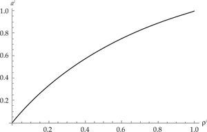 La gráfica a continuación muestra la forma de la función f(ρ) para un valor particular del parámetro φ=2. Como puede observarse, se trata de una función monótonamente creciente con f'>0 y f ”<0.