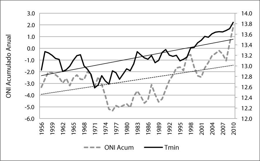 Asimismo, las menores temperaturas mínimas medias en la estación Agronomía se presentaron entre 1967 y 1972, en donde sobresalieron, por ser los años más fríos de la serie, 1968 y 1971, el primero de los cuales fue en su mayoría dominado por la condición El Niño y 1971, que en su mayoría estuvo bajo condición La Niña, mostrando la escasa relación que hay entre este elemento del clima y el ENOS. Sin embargo, al acumular el ONI en la escala anual, índice que revela el comportamiento a largo plazo de la temperatura del agua superficial del Pacífico Tropical, se observa que la acumulación de éste tiene una relación fuerte con la temperatura mínima media anual, como se observa en la Figura 18 y Tabla 4
