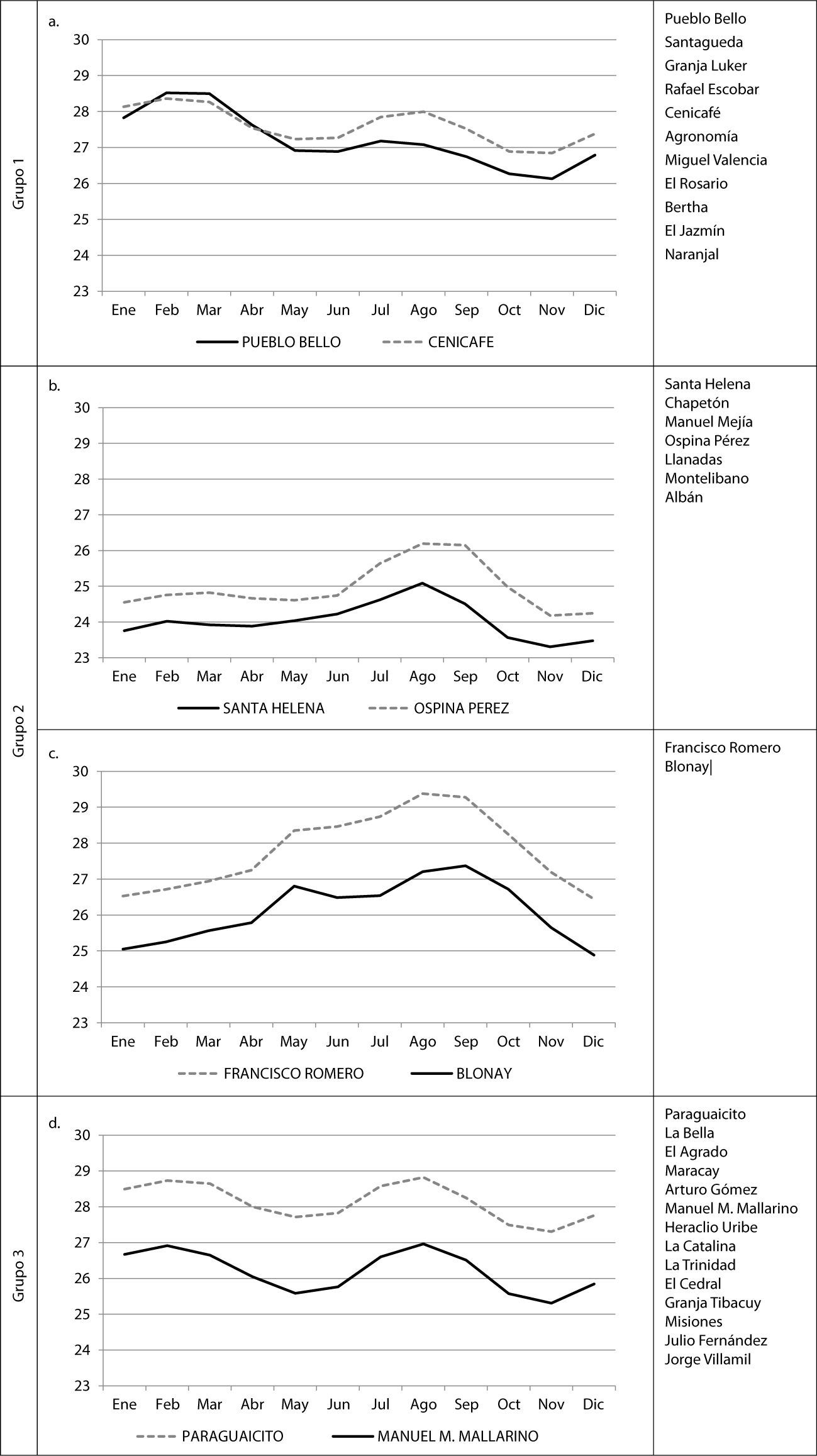Tal comportamiento, en el que la estación de Norte de Santander, ubicada a menor ASNM, tiene temperaturas más bajas que la estación Santagueda (Caldas), que se encuentra 123 m más alta, puede estar asociado con la latitud y se explica en el hecho de que a 7° norte hay un efecto latitudinal que determina una temperatura más alta a mitad de año (verano del hemisferio norte) y una temperatura más baja entre diciembre y enero (invierno del hemisferio norte), como se observa en la Figura 5. La temperatura baja a principio y final de año, cuando el Sol se encuentra aparentemente sobre el hemisferio sur, afecta los datos de temperatura media anual de la estación Francisco Romero haciéndola más fría que la estación Santagueda.