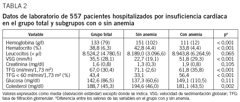 En el período comprendido entre 1 de enero de 2000 y el 31 de diciembre de 2002 ingresaron de forma consecutiva en el Servicio de Cardiología de un hospital terciario del noroeste de España 630 pacientes con el diagnóstico de ICC, definida según los criterios modificados de Framingham (criterios mayores: disnea paroxística nocturna, ortopnea, crepitantes pulmonares, ingurgitación venosa yugular, tercer ruido cardíaco, signos radiológicos de congestión pulmonar y cardiomegalia; criterios menores: disnea de esfuerzo, edemas periféricos, hepatomegalia, derrame pleural; el diagnóstico se consideraba positivo al reunirse al menos 2 criterios mayores, o bien un criterio mayor y 2 menores). Los reingresos se excluyeron del presente análisis y sólo se consideró válido el primero ocurrido durante el período de estudio. Además, para la inclusión en el presente análisis era necesaria la existencia de un estudio analítico de la sangre con determinación del hemograma en el momento del ingreso (antes de la realización de cualquier prueba diagnóstica o terapéutica). Al final, la población de estudio la formaban 557 pacientes. Los excluidos por falta de hemograma al ingresar no presentaban diferencias significativas con el resto del grupo. Para la definición de anemia se han utilizado los criterios de la Organización Mundial de la Salud: valores de hemoglobina plasmática < 130 g/l en varones y < 120 g/l en mujeres20.