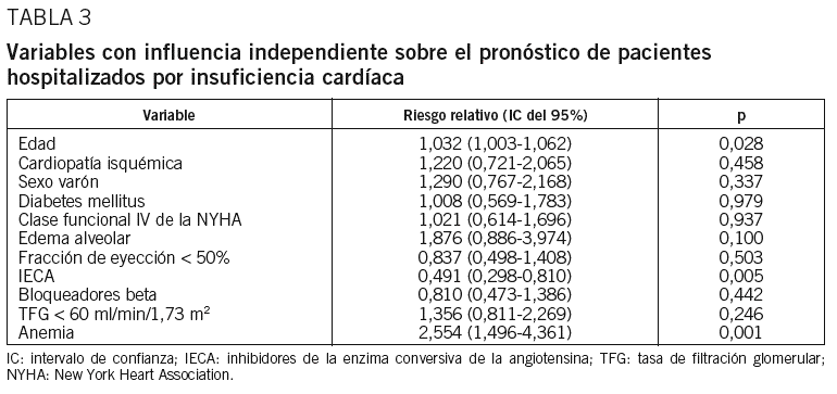 En el análisis multivariado ajustado por edad, sexo, etiología, clase funcional, edema alveolar, FSVI, insuficiencia renal (TFG < 60 ml/min/1,73 m2), prescripción de IECA y bloqueadores beta, la presencia de anemia ha demostrado ser el predictor independiente de mortalidad más potente, con un riesgo relativo de 2,55 (intervalo de confianza [IC] del 95%, 1,49-4,36; p = 0,001) (tabla 3).