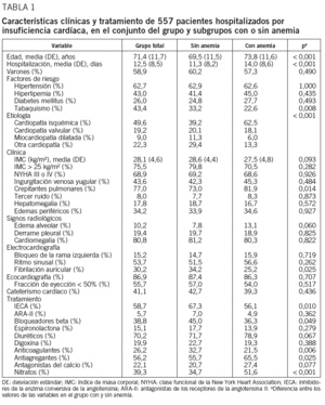 La anemia en pacientes con ICC podría ser un reflejo de la hemodilución que pueden presentar estos pacientes. Los resultados de un estudio reciente indican que la anemia asociada a hemodilución en pacientes con ICC parece asociarse a un peor pronóstico que la anemia real31, aunque se trata de un estudio con un número de pacientes muy escaso. Nosotros no conocemos la proporción de pacientes que presentan ambos tipos de anemia, aunque es posible que el componente de hemodilución tenga un papel relevante, ya que la congestión era la causa del ingreso hospitalario en la mayoría de los casos.