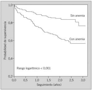 El seguimiento medio ha sido de 1,4 años y se ha podido llevar a cabo en 529 pacientes. Al final del estudio, 114 pacientes habían fallecido, 75 (31,6%) en el grupo de los anémicos y 39 (13,4%) en el grupo de los no anémicos.