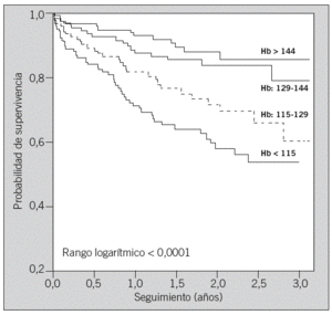 Se realizaron curvas de supervivencia, utilizando el método de Kaplan-Meier, en el grupo total de pacientes para valorar la asociación de la anemia con la supervivencia, así como para valorar la supervivencia de los pacientes con cuatro niveles equiparables (cuartiles) de hemoglobina, utilizando el test de rangos logarítmicos para valorar las diferencias de supervivencia entre los grupos.