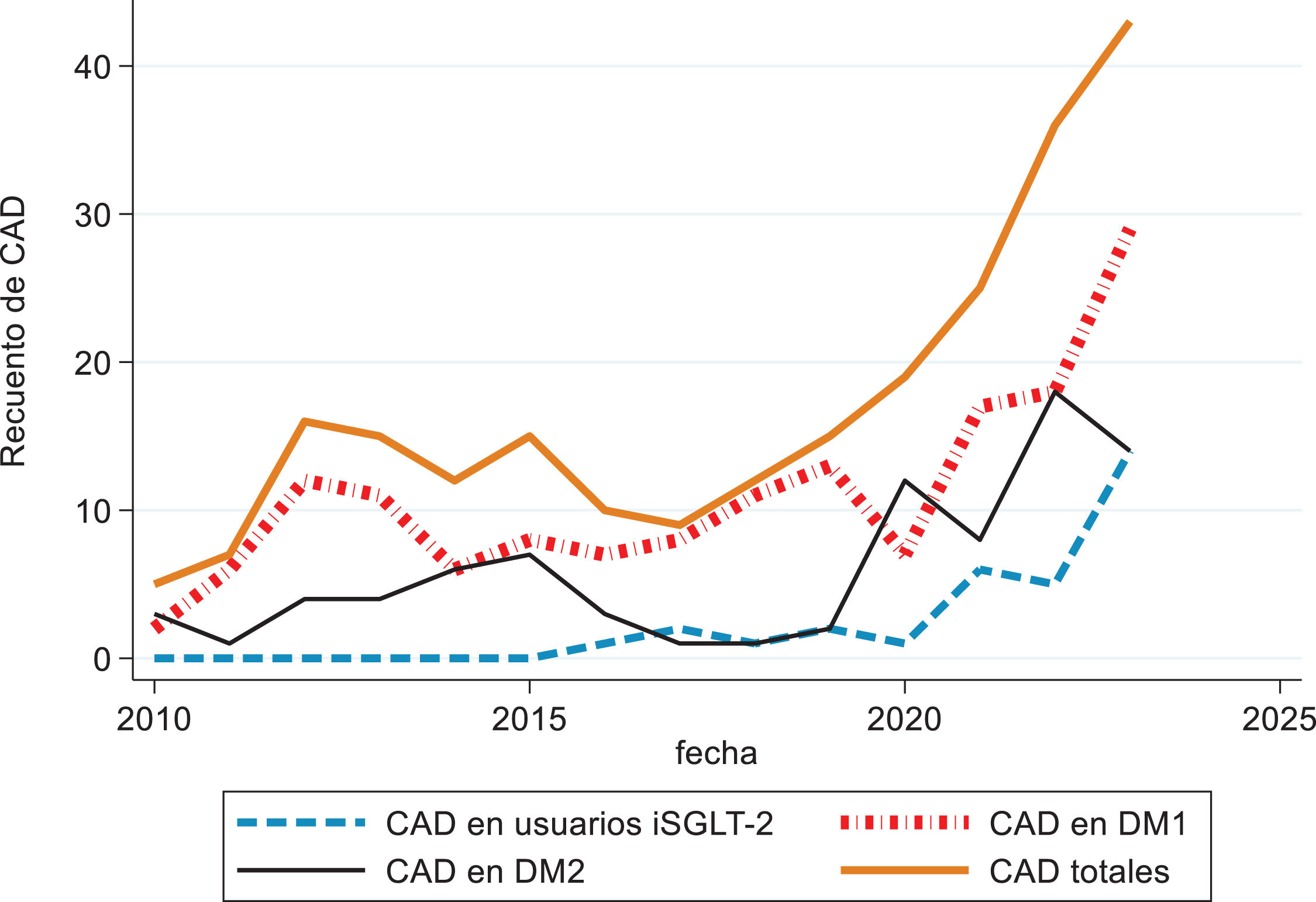 La gráfica muestra un incremento progresivo en los casos de CAD desde 2010, con una aceleración marcada a partir del año 2020. Este aumento se observa de forma consistente tanto en los pacientes tratados con iSGLT-2 (línea azul discontinua), como en aquellos con DM1 (línea roja discontinua) y DM2 (línea negra continua). En particular, los pacientes tratados con iSGLT-2 presentan un crecimiento proporcional de CAD en línea con la adopción creciente de esta clase terapéutica en la práctica clínica. Este análisis sugiere que múltiples factores, incluyendo cambios en los enfoques terapéuticos y el impacto de comorbilidades, podrían haber contribuido a estas tendencias. CAD: cetoacidosis diabética; iSGLT-2: inhibidores del cotransportador de sodio-glucosa tipo 2.