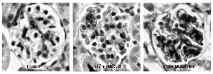 En el modelo experimental de nefropatía diabética inducida mediante estreptozotocina, la inhibición crónica de la ECA2 con un inhibidor específico, el MLN-4760, empeoró las lesiones renales de dicha enfermedad60. Es interesante comentar que, a su vez, la administración de MLN-4760 se asocia a un aumento de la expresión glomerular de la ECA (fig. 3). Así, con la inhibición crónica de la ECA2 se produce una doble activación del SRAA: la disminución de la degradación de la angiotensina II, con el consiguiente aumento de los valores de angiotensina II intraglomerular, y el incremento de la expresión de la ECA, que conduce a un aumento de la formación de angiotensina II a partir de la angiotensina I. Además, la disminución de la degradación de angiotensina II llevará a una disminución de la formación de an giotensina 1-7, un péptido que tiene un efecto antiproliferativo13,14,62.