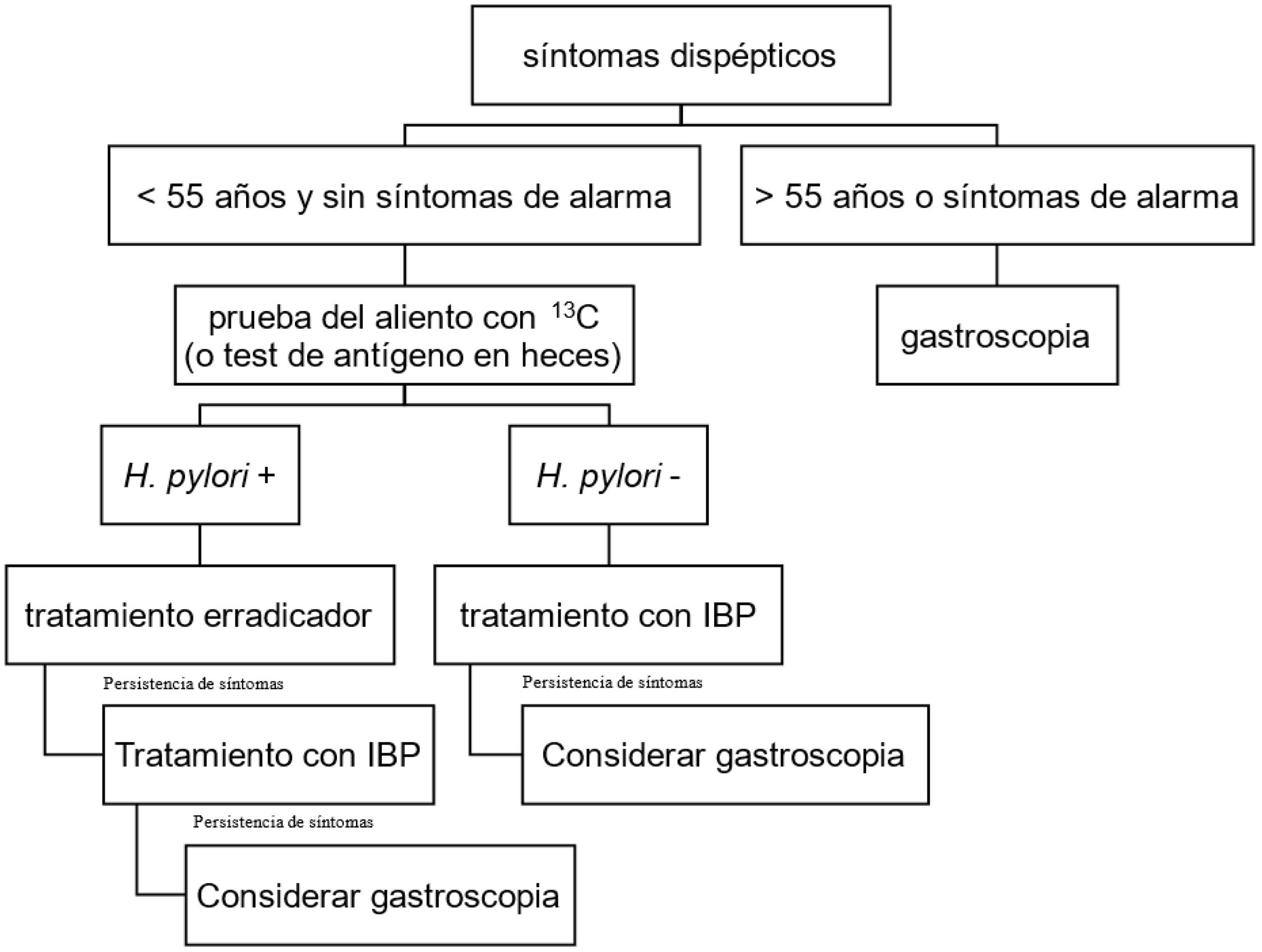 La infección por Helicobacter pylori es la más frecuente del planeta, afectando a la mitad de la población mundial. Se transmite habitualmente durante la infancia, y persiste de por vida si no se trata. Es la causa principal de gastritis crónica, úlcera péptica y cáncer gástrico. En los pacientes dispépticos jóvenes y sin síntomas de alarma, la estrategia «test-and-treat» (detección de H. pylori mediante una prueba no invasiva y su consiguiente erradicación) es de elección. El papel causal de la infección en el desarrollo del adenocarcinoma gástrico ofrece la oportunidad de implementar estrategias preventivas. La infección se puede diagnosticar mediante métodos invasivos (que requieren endoscopia, como el test rápido de la ureasa o la histología) y no invasivos (como la prueba del aliento o el test de antígeno en heces). El tratamiento de H. pylori combina un inhibidor de la bomba de protones junto con varios antibióticos o sales de bismuto.