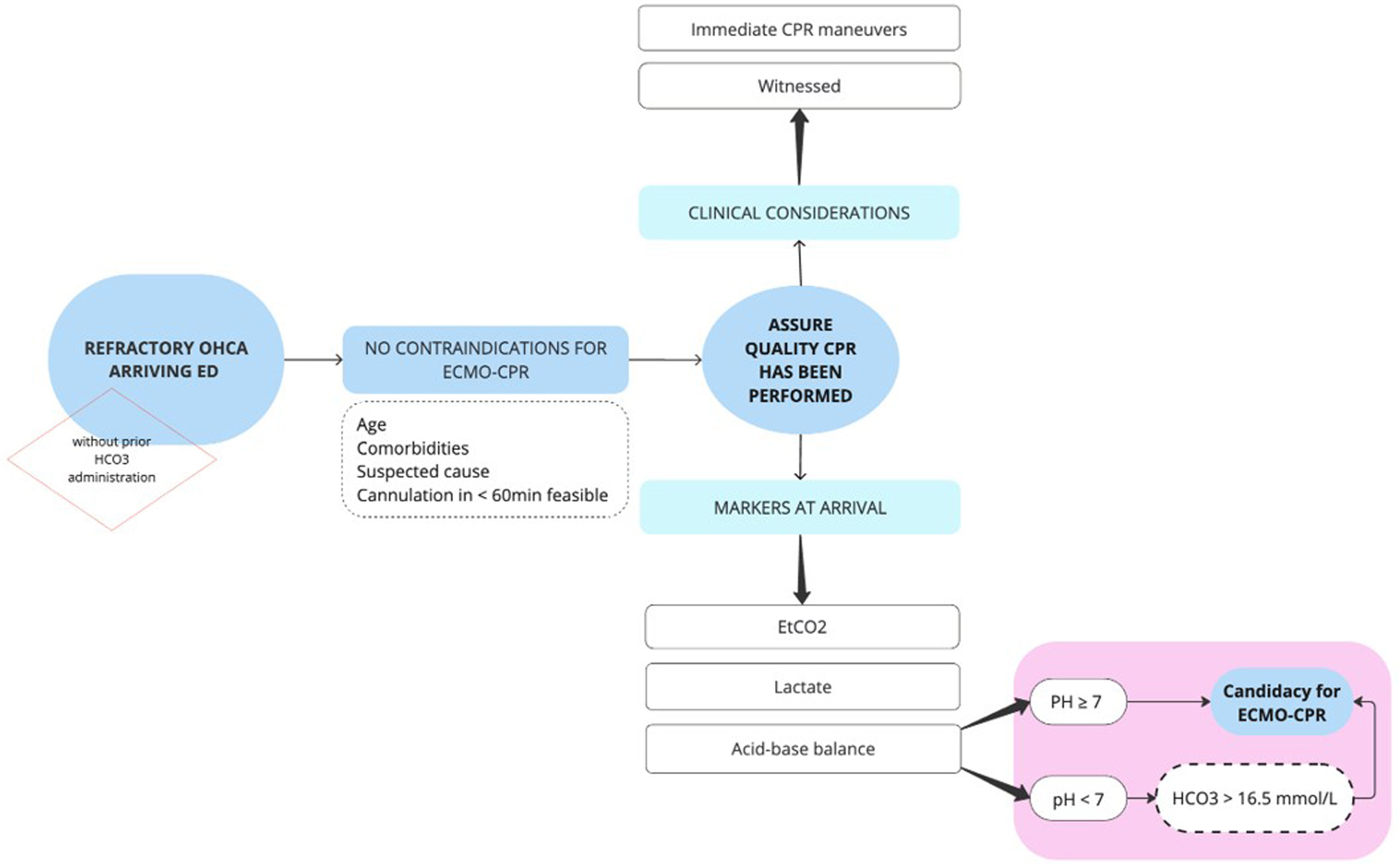 La mortalidad tras una parada cardíaca extrahospitalaria (PCEH) es excesivamente elevada. La resucitación mediante membrana extracorpórea al ingreso podría mejorar la supervivencia, sin embargo, la selección de candidatos para esta terapia supone un reto. Encontrar biomarcadores a la llegada con mayor capacidad predictiva de encefalopatía hipóxico-isquémica (EHI) podría ayudar en la toma de decisiones. Nuestro objetivo es analizar el valor de los componentes del equilibrio acido-base en este escenario.