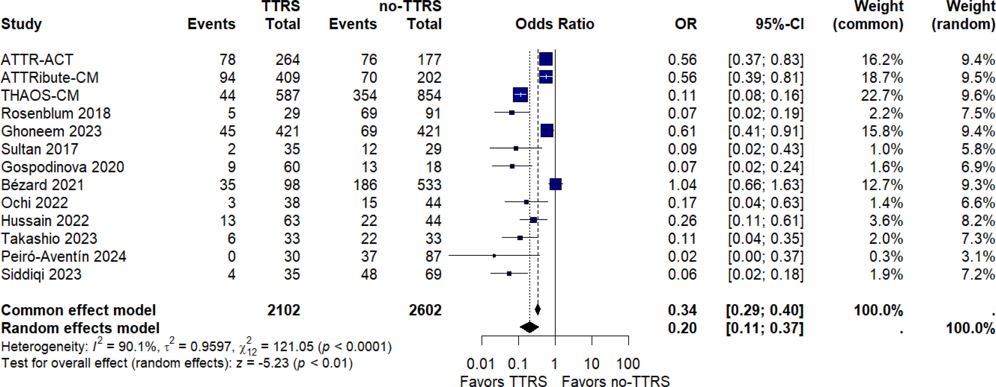ResultsSeventeen studies with 5209 participants (2399 TTRS; 2810 controls) were included. TTRS significantly reduced all-cause mortality (OR 0.20; 95% CI 0.11–0.37; p<0.01). In the tafamidis subgroup, the effect remained significant (OR 0.25; 95% CI 0.13–0.48; p<0.01). No mortality benefit was observed in groups with mixed tafamidis doses (OR 0.75; 95% CI 0.41–1.38; p=0.14). TTRS improved quality of life (KCCQ-OS: MD 11.70) and functional capacity (6-minute walk test: SMD 50.68). Fewer adverse events (OR 0.19) and serious events (OR 0.54) were reported, with no difference in severe events.
