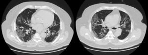 A chest CT severity score was used in our study to evaluate the severity of pulmonary involvement, as proposed by Chung et al.19 The parameter used in this score was lung lobar extension. The GGO extension in each of the 5 lobes of the lung was scored as follows: no involvement (0), minimal involvement (1), mild (2), moderate (3), and severe involvement (4). A total severity score is thus obtained by adding the scores of each of the 5 lobes (range 0–20). The total was then multiplied by 5 to have a percentage.