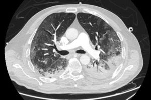 Our study shows no correlation between LDH levels on admission and the risk of pulmonary consolidation, so LDH cannot be used as a marker of an infectious process.