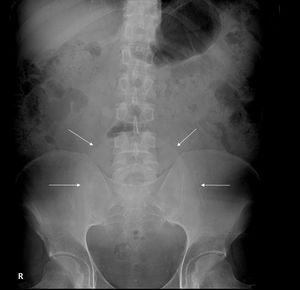 En la analítica sanguínea destacaba un fracaso renal agudo (creatinina 4,1mg/dl, urea 139mg/dl y potasio 4,8 mmol/l) con leve elevación de los reactantes de fase aguda. La radiografía de abdomen (fig. 1) mostró un globo vesical, confirmado posteriormente con ecografía que, además, reveló ectasia uretero pielocalicial bilateral grado moderado severo.