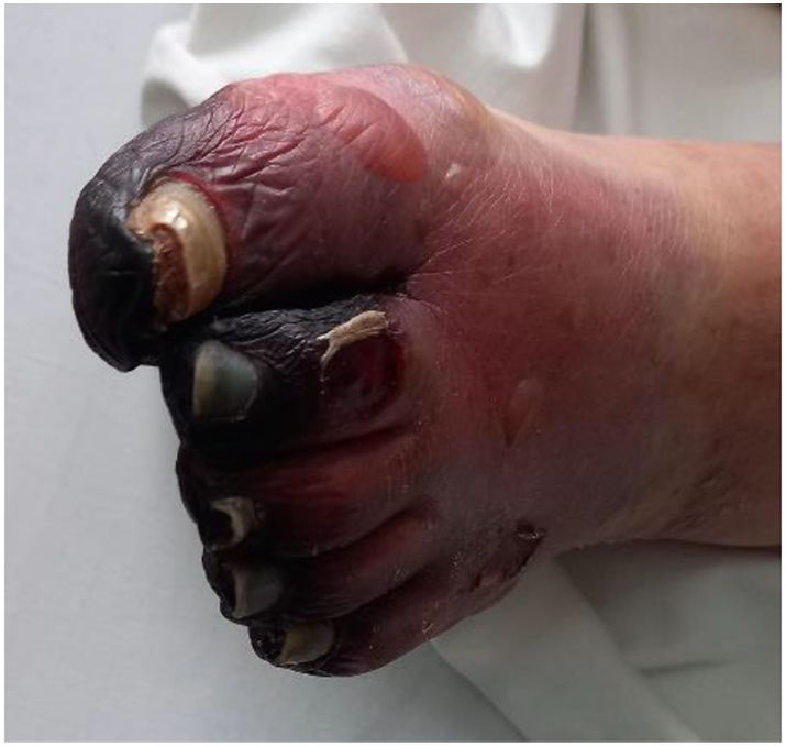 Caso clínicoPaciente mujer de 69 años de edad ingresa por cuadro de pie diabético infectado con indicación de amputación supracondílea (fig. 1), durante su evolución presenta hipotensión marcada (70/40 mmHg) que no responde a fluidoterapia asociado a oliguria y alteración del estado mental (confusión), por lo que se decide iniciar norepinefrina 4 mg/ml x 1 ml en 200 ml de suero glucosado y se empieza infusión vía periférica, llegando a requerir por 36 horas hasta un máximo de 10 ml/h. Luego, se cambió por acceso venoso central, paciente recuperó estabilidad hemodinámica, fue intervenida quirúrgicamente resolviéndose el cuadro; sin embargo, 24 horas después de iniciado la infusión de norepinefrina la paciente presentó en dicha zona una mácula oscura que luego progresa a zona necrótica (fig. 2).