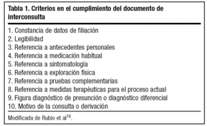 Respecto al grado de cumplimiento del documento de interconsulta (tabla 3), los criterios con niveles más altos de cumplimiento fueron: constancia de datos de filiación (96,3%), legibilidad del documento (95,3%), descripción de sintomatología (88,1%) y motivo de derivación (86,7%). Los criterios con mayor grado de incumplimiento fueron los referentes a los antecedentes personales (56,3%), la exploración física (32%), el tratamiento habitual (19,2%) y el tratamiento de la enfermedad actual (16,8%). En el 22% (n = 94) constaba la existencia de un diagnóstico específico de presunción.