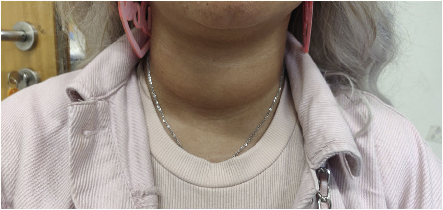 In a follow-up visit, after two weeks, the symptoms persisted, with no significant response to beta-blocker therapy. On physical examination, an increase in neck circumference was evident when compared to the previous observation (Fig. 1). On palpation, the thyroid was globose, with an elastic consistency, without thrill or nodules. There was no exophthalmia. Thus, a repeat of thyroid function tests and thyroid ultrasound study was requested.