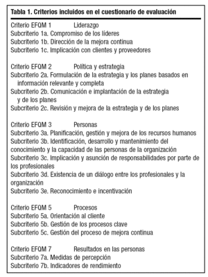 Para dicha evaluación se utilizó un cuestionario adaptado del Modelo EFQM de Excelencia aplicable a un EAP y aportado por la Dirección-Gerencia de Atención Primaria del Área 11 de Madrid. El cuestionario se diseñó teniendo en cuenta documentación de apoyo y experiencias parecidas en otras instituciones11, e incluía la definición de cada criterio del modelo a evaluar con los subcriterios correspondientes y áreas a tratar. También indicaba la recogida de los aspectos positivos en relación con las mismas (PF) y aquéllos susceptibles de mejorar (AM). Como el fin último era la evaluación de la organización interna del EAP al menor coste posible, no se incluyó ningún procedimiento de puntuación propio de aplicaciones más avanzadas del modelo y que suelen utilizarse para la comparación interna y externa. También se pretendía conseguir la mayor adaptabilidad pragmática posible del modelo al proceso evaluador periódico que deben afrontar los EAP al realizar su memoria anual de actividad.