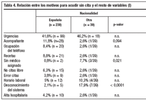 En las tablas 4 y 5 se recogen las relaciones entre las variables y los motivos para acudir sin cita. Así, se encontró que entre los españoles el porcentaje que acudía sin cita por no tener médico asignado o por desconocimiento del sistema de citación era menor que entre los no españoles (0,8% frente al 7,7% y el 2,1% frente al 17,9%, respectivamente). Por otra parte, un menor nivel de estudios se relacionaba significativamente con acudir sin cita por error (6,1% frente al 0%) e inversamente con incompatibilidad con el horario laboral (2,5% frente al 11,1%). El porcentaje de PSC que acudían acompañando a otra persona o por error en la cita era mayor entre los no activos laboralmente (15,6% frente al 4,1% y el 6,5% frente al 0%, respectivamente), mientras que en los activos era significativamente mayor el porcentaje de pacientes que acudían por incompatibilidad con el horario laboral (12,2% frente al 0,6%). Entre los que acuden en horario de mañana es significativamente mayor el motivo de ocupación de la línea telefónica (11,9% frente al 2,4%) y significativamente menor los que acuden acompañando a otro paciente (5,3% frente al 16,7%).