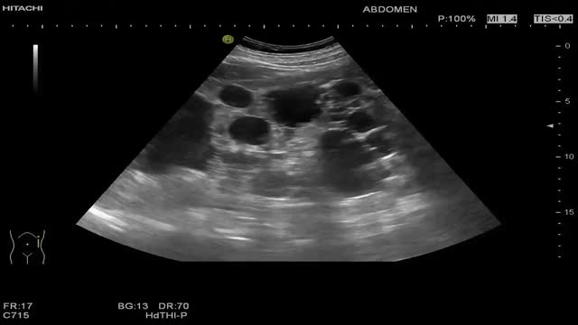El diagnóstico ecográfico de una poliquistosis en pacientes con antecedentes familiares es (video 2):