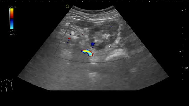 Ecográficamente es imposible distinguir entre los diferentes tipos de carcinoma renal. Normalmente se observa una masa renal sólida, generalmente heterogénea, dependiente de la corteza renal, más o menos exofítica, de predominio hipoecogénico. Las lesiones de muy pequeño tamaño suelen pasar desapercibidas con ecografía. Cuando se observa una lesión sólida hiperecogénica suele indicar presencia de grasa y por tanto podría tratarse de un angiomiolipoma, pero no siempre es así, por lo que, dependiendo del tamaño, las características y los síntomas (hematuria) y/o factores de riesgo del paciente puede estar indicado una TAC o una RMN. Durante la ecografía es importante utilizar el Doppler color para valorar la vascularización intralesional, que en caso de confirmarse es un criterio de malignidad, pero en los casos en los que el Doppler sea negativo no indica benignidad. Otro dato importante es la morfología de la lesión. Cuando una lesión es redondeada y de bordes bien definidos, se sospecha benignidad; mientras que una lesión de bordes mal definidos o lobulados es más sospechosa de malignidad15 (fig. 4 y video 5).