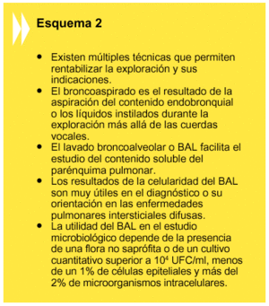 La tinción de Papanicolau o Giemsa permite la identificación del contenido celular, aunque pueden aplicarse otras técnicas como la citometría de flujo, enzimoinmunoanálisis o anticuerpos monoclonales, que ayudan a identificar las subpoblaciones linfocitarias y la posibilidad de un linfoma. El BAL ha sido utilizado para el estudio de masas o nódulos pulmonares periféricos en busca de células neoplásicas, aunque con una rentabilidad limitada que aumenta hasta el 70-80% de los pacientes con un linfoma, carcinoma bronquioloalveolar o linfangitis carcinomatosa. La microscopia electrónica puede facilitar el diagnóstico de la histiocitosis X, la tinción de PAS de la proteinosis alveolar, la tinción de Sudán de la neumonía lipoidea, la tinción de plata-metanamina para la infección por P. carinii y la tinción de Pearls confirma la presencia de macrófagos cargados de hemosiderina o hemosiderófagos en la hemorragia alveolar.