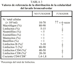 En los pacientes sanos, el líquido recuperado suele ser espumoso y blanquecino-transparente, mientras que en los fumadores es marrón-negruzco, en los pacientes con una neumonía lipoidea con gotas de grasa flotantes, de aspecto lechoso en la proteinosis alveolar o sanguinolento en la hemorragia alveolar (fig. 7). El análisis microbiológico es definitivo para el aislamiento de patógenos no saprófitos y especialmente útil para el diagnóstico de infecciones oportunistas en los pacientes inmunodeprimidos. El riesgo de contaminación por el contenido del canal tras el paso por la orofaringe aconseja que, para el estudio bacteriano o de flora saprófita, tengamos en cuenta la presencia de menos del 1% de células epiteliales, más del 2% de microorganismos intracelulares y un cultivo cuantitativo por encima del 104 UFC/ml. No obstante, su análisis citológico es actualmente uno de los más utilizados y es considerado como el de mayor relevancia en las enfermedades pulmonares difusas, por su valor diagnóstico y pronóstico (tabla 2).