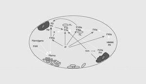 La coagulación sanguínea es el conjunto de reacciones que dan lugar a la formación de trombina, enzima clave de la coagulación, en el punto de lesión vascular (fig. 1)2. Este sistema se inicia en la superficie de las células endoteliales a través de la exposición del factor tisular al torrente sanguíneo. Éste se une al factor VII activado (FVIIa), y el complejo enzimático resultante activa los factores IX y X3. Los FVIIa, FIXa y FXa intervienen en un sistema de retroalimentación positiva al activar el factor VII unido al factor tisular. Por otra parte, el FIXa por la vía del factor tisular, activa el factor X, en una reacción que es acelerada por un cofactor, el FVIIIa. La exposición del factor tisular da lugar a la vía extrínseca de la coagulación y es el mecanismo por el cual se inicia la coagulación in vivo en respuesta a la lesión vascular. Otra vía de la coagulación es la vía intrínseca formada por el FXII, el quininógeno de alto peso molecular, la precalicreína y el FXI. El papel fisiopatológico de esta vía no está completamente aclarado ya que no interviene significativamente en la coagulación a partir de la lesión vascular y, además, los déficit congénitos de las proteínas de este sistema no provocan problemas hemorrágicos excepto la deficiencia del FXI. El resultado final de las dos vías descritas es la activación del FX. El FXa forma con su cofactor, el FV, el complejo protrombinasa que convierte el FII (protrombina) en FIIa (trombina). La activación del factor V se produce por el FXa y la trombina. En la etapa final de la coagulación, la trombina divide el fibrinógeno para generar monómeros de fibrina que se polimerizan uniéndose unos a otros para formar un coágulo que es estabilizado por el FXIII. La trombina también se retroalimenta activando al FVIII y al FIX. El FVIII circula unido al factor von Willebrand4 y, una vez activado, se separa de éste y forma junto al FIXa en la superficie plaquetaria un complejo que activa al FX. La activación del FXI por la trombina es otro sistema de retroalimentación que da lugar a la generación de FIXa, el cual activa a su vez al FX5.