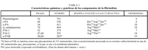 Las enzimas del sistema de la fibrinólisis son proteasas del tipo serina, es decir, su locus activo está compuesto por los aminoácidos serina, ácido aspártico e histidina, dando lugar a la llamada región catalítica. Este locus activo se localiza en la región carboxiterminal de las moléculas, mientras que las regiones aminoterminales contienen uno o más dominios estructurales y funcionales, como los dominios finger (por analogía con los finger de la fibronectina), el dominio factor de crecimiento epidérmico (EFG) y los dominios kringle. Los inhibidores del sistema de la fibrinólisis son miembros de la superfamilia de las serpinas (inhibidores de las serinproteasas). En este caso, en el extremo carboxiterminal poseen un péptido reactivo específico (arginina-X o lisina-X) que está unido a su enzima. Ello da lugar a una estructura inactiva con una función de inhibición enzimática. Las características químicas y genéticas de los principales componentes del sistema de la fibrinólisis quedan resumidas en la tabla 1.