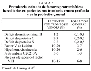 Los llamados estados hipercoagulables congénitos están constituidos por anomalías protrombóticas bien establecidas, la mayoría de las cuales son hereditarias. Tradicionalmente, estas causas genéticas de trombofilia se han estudiado en el contexto de familias con tendencia a padecer trombosis. La prevalencia estimada de estas alteraciones en la población general es de 1 cada 3.000-5.000 habitantes, mientras que una o más de estas anomalías trombofílicas pueden encontrarse en un 40-60% de los pacientes con un primer episodio de trombosis venosa37. Sin embargo, la prevalencia de estos factores en pacientes con trombosis es muy variable y oscila entre el 20% del factor V de Leiden y el 1% del déficit de antitrombina (tabla 2)37. Finalmente, se están evaluando en la actualidad nuevas anomalías, entre las que destacan un gran número de polimorfismos (de los factores II, VII, XII y XIII, de las proteínas C y S, del t-PA y tcu-PA y del PAI-1)38, de los que quizás los más prometedores sean los valores plasmáticos de FVIII y FXI. En dos situaciones pueden coexistir fenómenos trombóticos arteriales y venosos: el síndrome antifosfolipídico relacionado con la presencia de anticuerpos dirigidos contra complejos de fosfolípidos y proteínas y la hiperhomocisteinemia.