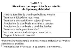 Existen una serie de indicaciones en las que este estudio se debe llevar a cabo de forma obligada (tabla 3). En estos casos una historia familiar de trombosis es un factor a tener en cuenta a la hora de realizar el estudio. Otras situaciones en las que parece estar indicado son las trombosis idiopáticas y las que aparecen en el curso del embarazo, el puerperio y el período neonatal, así como mujeres con pérdidas fetales de repetición, complicaciones gestacionales graves y aquellas que desarrollan trombosis tras el uso prolongado de anticoncepción oral72.