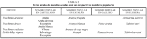 Las arañas de mar que viven en nuestras costas (tabla 2) pertenecen a dos géneros: Trachinus (caracterizados por dos pequeñas espinas encima de los ojos) y Echiichthys. Ambos viven cerca del fondo marino pero se acercan a las playas, donde se semientierran en la arena9,10.