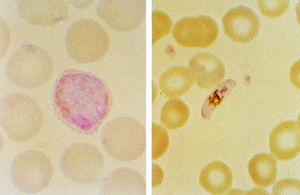 Fig. 1. Extensión fina de sangre que presenta un trofozoito en un primer estadio (forma de anillo) de P. vivax (izquierda). Trofozoito ameboide más maduro de P. vivax (derecha). Coloración Giemsa.