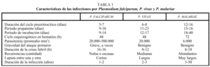 La esplenomegalia es uno de los signos clínicos más frecuentes en las personas parasitadas, aunque con frecuencia tarda varios días en palparse. En niños pequeños también es frecuente la aparición de hepatomegalia, que es más intensa cuanto menor es la edad. La ictericia aparece en algunos casos, no suele ser intensa, desaparece al cabo de 1-3 semanas y se debe a P. falciparum. Es importante reseñar que el paludismo no se acompaña de ningún tipo de erupción cutánea como en otras entidades, como la septicemia meningocócica, el tifus, la fiebre entérica, los exantemas virales, las reacciones a fármacos o la leptospirosis. En la tabla 1 se detallan algunas de las características de la infección producida por distintos tipos de plasmodios3.