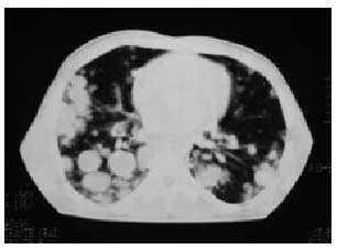 TC torácica: múltiples nódulos pulmonares, alguno de ellos necrosado, y adenopatías mediastínicas (figs. 1 y 2).