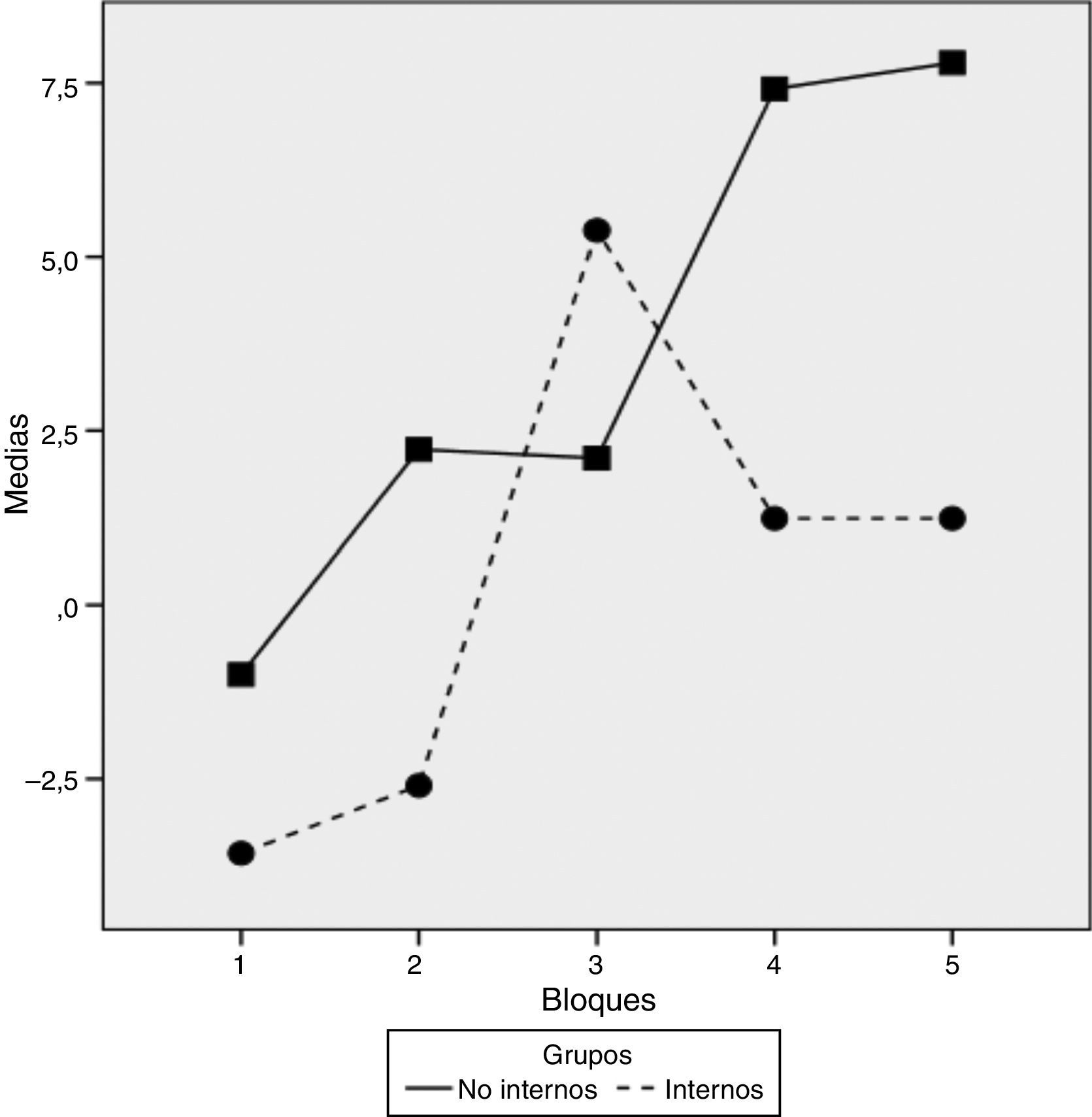 Además del análisis por paquetes y el índice general de toma de decisiones, se compararon los rendimientos de ambos grupos por bloques de 20 selecciones, para de esta forma estimar la curva de aprendizaje en la prueba. En la tabla 3 se muestran los valores estadísticos obtenidos posterior a la realización del ANOVA GLM de medidas repetidas. A diferencia del análisis por paquetes en los que solamente las cartas B mostraron un patrón distintivo entre los grupos, en la exploración por bloques los 5 segmentos de 20 selecciones mostraron diferencias altamente significativas entre los grupos estudiados (p < 0,001), con un tamaño de efecto grande (η2parcial¿ 0,014), lo cual ofrece evidencias adicionales sobre las dificultades en la toma de decisiones de los jóvenes con conducta antisocial cuando se comparan con jóvenes prosociales (tabla 2).