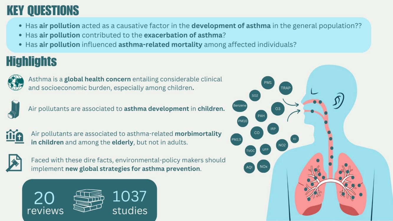 This review aimed to evaluate the evidence supporting an association between air pollution and the asthma development in the general population, as well as its association with the exacerbation of asthma symptoms and asthma-related mortality in affected individuals.