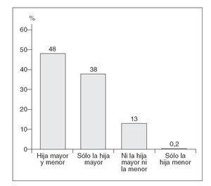 Las madres informaron de una mayor probabilidad de vacunar a una hija de mayor edad comparada con una de menor edad: el 48% tenía muchas o alguna probabilidad de vacunar a su hija de 9 a 12 años de edad, el 68% a su hija de 13 a 15 años de edad y el 86% a su hija de 16 a 18 años de edad. El 48% de las madres tenía muchas o alguna probabilidad de vacunarse si estuviera recomendado para su edad. La figura 1 muestra la probabilidad de vacunar a las hijas de mayor edad, comparado con las de menor edad. Algo menos de la mitad de las madres (48%) pretendía vacunar a una hija de menor o mayor edad, el 38% sólo a una hija de mayor edad, el 13% no quería vacunar a su hija y el 0,2% sólo pretendía vacunar a una hija de menor edad.