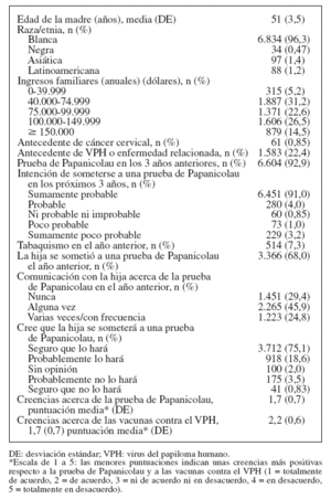 Las preguntas que evaluaron los resultados, intención de vacunar a una hija y a sí misma, estaban precedidas por un párrafo de introducción sobre el VPH y las vacunas específicas. El párrafo indicaba que: 1) el VPH provoca una infección muy común de transmisión sexual y que puede producir condilomas, anomalías en la prueba de Papanicolau, cáncer cervical y otros tipos de cáncer, y 2) la vacuna tetravalente contra el VPH podía prevenir ∼90% de los condilomas y el 70% de los cánceres cervicales, y tiene su máxima eficacia cuando se administra antes de la iniciación en las relaciones sexuales. Los resultados fueron: 1) la probabilidad, indicada por la madre, de vacunar a una hija en cada uno de los 3 grupos de edad (9-12, 13-15 y 1618 años), si tenía una hija en cada grupo y suponiendo que la vacuna es segura, asequible, eficaz y está recomendada para cada grupo de edad, y 2) la probabilidad, indicada por la madre, de vacunarse ella misma, si se recomendase la vacunación contra el VPH a mujeres de su edad. Las 5 posibles respuestas oscilaron entre sumamente probable y prácticamente imposible. Definimos las que pretendían vacunar a su hija como las que informaron de una gran o media probabilidad de solicitar la vacunación de una hija en cada grupo de edad. Las que no deseaban vacunar a su hija fueron las que informaron que solicitar la vacunación de su hija no era probable ni improbable, poco probable o prácticamente imposible.