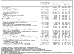 Las variables significativamente asociadas con la intención (definida como muy o algo probable) de vacunar a una hija de menor edad (9-12 años de edad) en los modelos de regresión logística no ajustados fueron: factores demográficos, historia de VPH y de prueba de Papanicolau, intención de realizar una prueba de Papanicolau, tabaquismo, comunicación con la hija acerca de la prueba de Papanicolau, creencia en que la hija se someterá regularmente a una prueba de Papanicolau, creencias personales sobre la prueba de Papanicolau y creencias sobre las vacunas contra el VPH (tabla 2, modelo 1). La probabilidad de clara concordancia, comparada con una abierta discordancia, entre la intención de vacunar a una hija y cada uno de los puntos de la escala que mide las creencias acerca de las vacunas contra el VPH osciló entre 3,4 y 17,4. La máxima razón de probabilidad (> 10,0) correspondió a la asociación con la creencia de que la vacuna contra el VPH protege frente al cáncer, y que las vacunas son una buena forma de proteger la salud de la hija. En los modelos de regresión logística ajustados, las variables significativamente asociadas con la intención de vacunar a una hija de menor edad (9 a 12 años) fueron la creencia en que la hija se sometería regularmente a la prueba de Papanicolau y las creencias sobre las vacunas contra el VPH (tabla 3, modelo 1). El aumento en una unidad de la puntuación media en la escala de creencia en la vacuna contra el VPH se asoció con casi 5 veces la probabilidad de pretender vacunar a una hija de 9 a 12 años de edad contra el VPH.