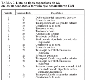 TABLA 2. Lista de tipos específicos de CC en los 18 neonatos a término que desarrollaron ECN